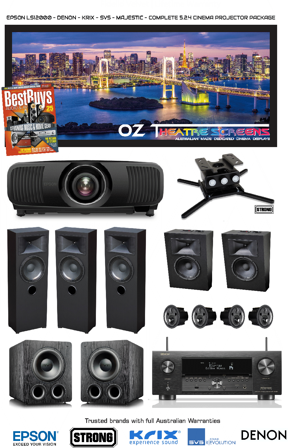 Package can be modified to suit room requirements including Krix in wall LCR’s and Acoustic Vision screen fabric. Other changes such as 2 extra surround speakers and changes to the Atmos speaker range and amount. Screen size is not set nor format. 16:9 format also available. (Screens over 4 metres in length may incur an over oversize shipping charge, inquire to find out more) Receiver can be upgraded to the Denon X6800H for 11 channels or Marantz Cinema 30 11 channel (if adding in 2 extra surround speakers) etc. Projector can also be upgraded to a JVC N series native 4K laser projector such as the DLA-NZ500, DLA-NZ700, DLA-NZ800 and DLA-NZ900 (at extra costs)